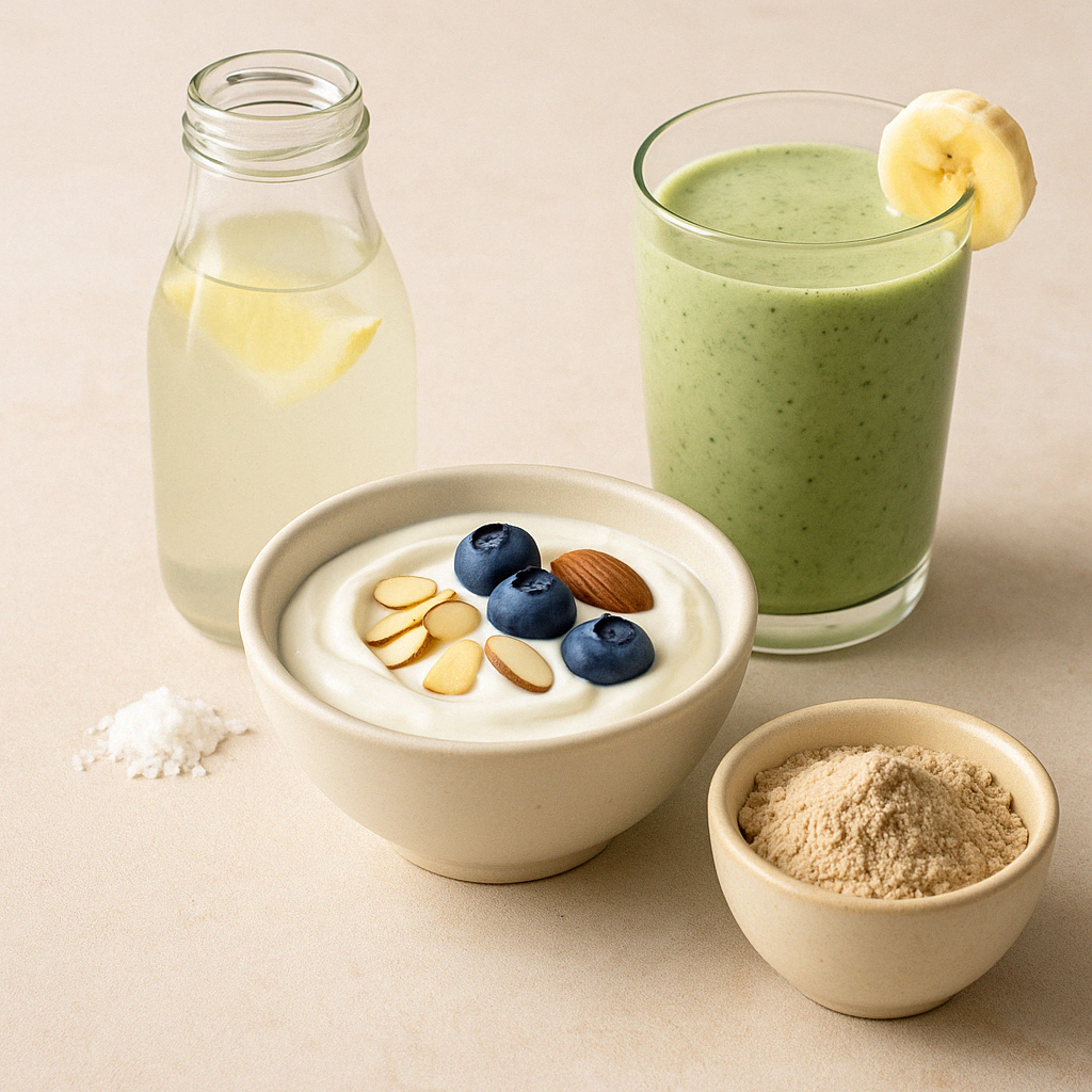 • 발효 단백질 스무디: 소화력이 약한 사람은 유청 단백질(Whey)보다 발효된 식물성 단백질이나 프로바이오틱 단백질이 더 나은 선택일 수 있습니다. 바나나, 아몬드밀크, 발효 단백질 파우더, 치아시드 등을 블렌딩해 스무디로 섭취하면 장을 진정시키는 동시에 근육 회복도 도와줍니다. 여기에 프로바이오틱스를 추가하거나, 천연 발효 단백질을 활용하면 장까지 고려한 회복이 가능해집니다. 운동 직후엔 ‘장 부담 최소화 + 수분 회복 + 유익균 공급’이 핵심입니다. 이 시기를 잘 보내야 이후 식사의 흡수와 회복이 더 원활해지고, 장 트러블이나 속 불편함 없이 다음 날을 맞이할 수 있습니다. 운동 직후는 장이 예민해져 있는 시기입니다. 이때는 고단백, 고지방 식사보다 수분과 전해질, 장을 위한 유익균 공급이 우선입니다.